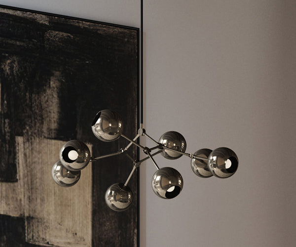 101 CPH Drop Chandelier mini globe lysekrone i chrome. Pendel lampe i blank chrome med 8 stk. skærme. Designet af Kristian Sofus Hansen & Tommy Hyldahl.