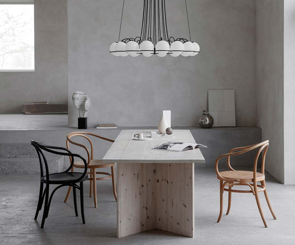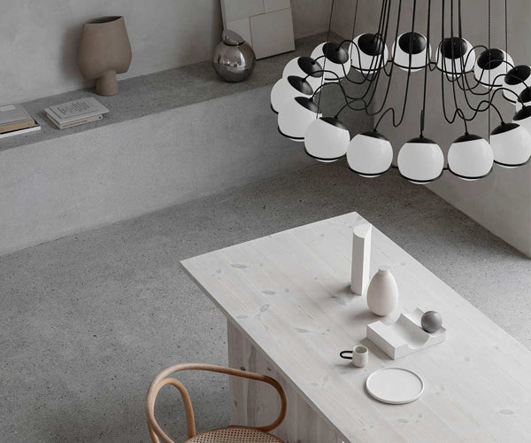 Astep Model 2109 med 16 Opaline glaskugler og struktur i sort. Designet af Gino Sarfatti for Astep design. De 16 kugler / lyskilder måler hver 20 cm. i diameter.