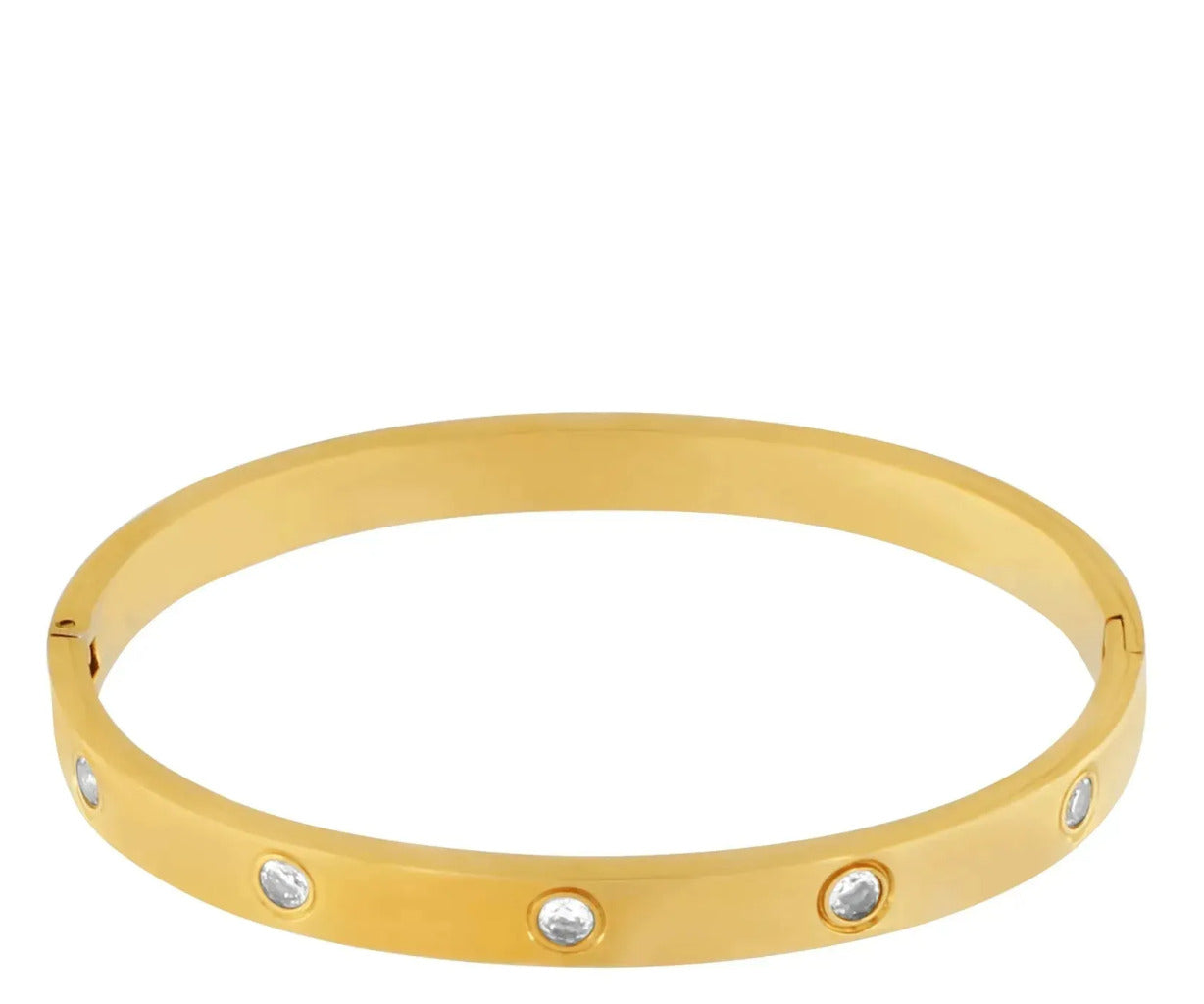 Dansk Copenhagen Joy armring - CZ gold - waterproff. Med denne Joy armring tilføjer du et strejf af moderne elegance til ethvert outfit, med et holdbart og stilfuldt smykke, til både hverdagsbrug og en tur i byen. Joy er lavet med 18K vandfast guldbelægning, påsat klare skinnende kubiske zirkonia sten.