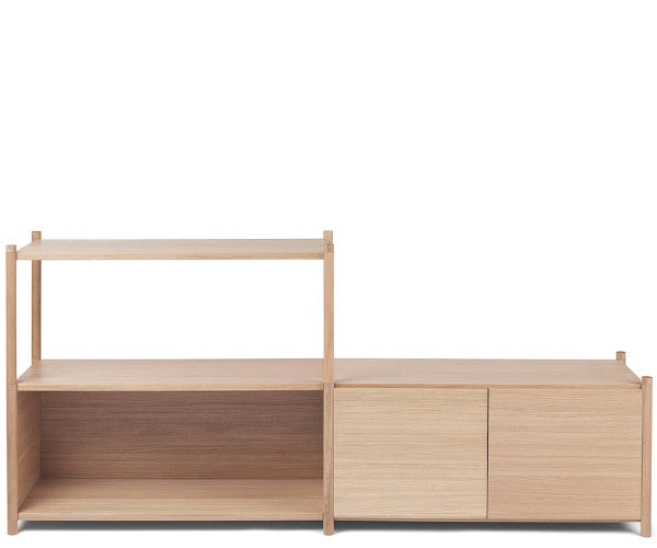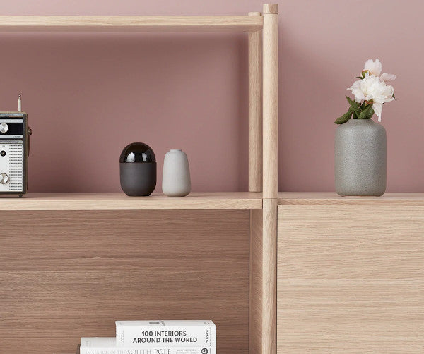 Gejst Sceen reol D. Modulbaseret reolsystem, fremstillet i egetræ. Modul for modul kan reolsystemet bygges op i højden eller forlænges til siderne. Modul 1 fungerer som fundament for alle opbygninger. Med udgangspunkt i denne kan du eksempelvis tilføje Modul 3, hvis man ønsker den højere eller Modul 2, hvis den ønskes bredere. Sceene Reol Moduler kan tilføjes døre, side og bagpaneler, og dermed kan man skabe en funktionel reol, hvor der både er plads til feriebilleder, arvestykker og de ting man har lyst til at gemme væk.
