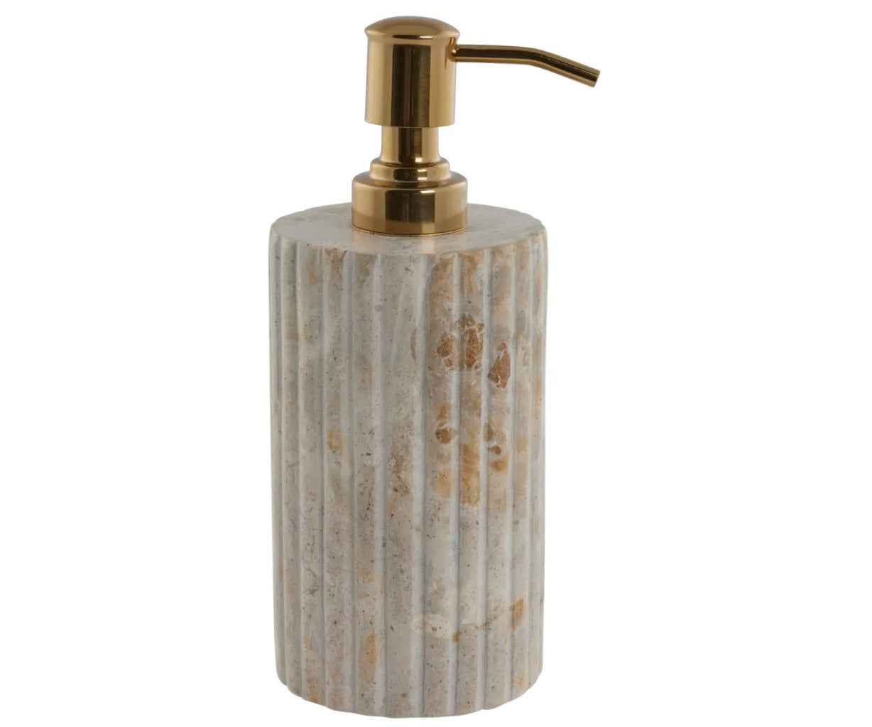 Lene Bjerre Eliana sæbedispenser i massiv sand marmor og pumpe med messing finish. Eliana er den perfekte tilføjelse til dit stilfulde badeværelse. Eliana er en smuk og klassisk sæbedispenser er fremstillet marmor, hvilket giver et tidløst og elegant look. Marmor er samtidig et holdbart og praktisk materiale. Se relaterede produkter for både bakke samt tandkrus i samme serie.