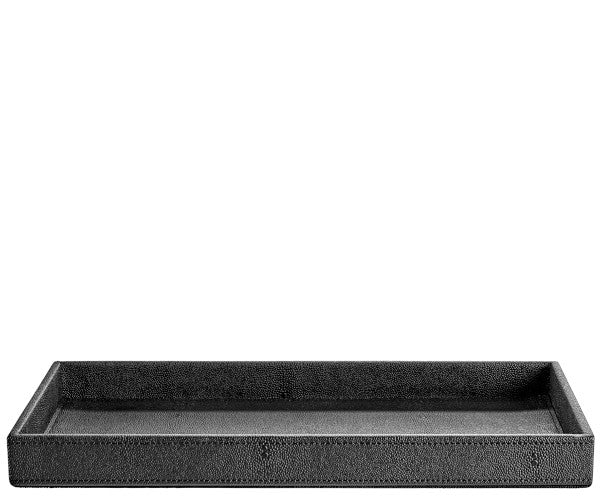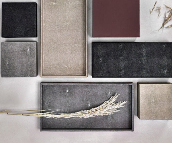 Mojoo Sting bakke - black - 38x19 cm. Bakken er beklædt med faux stingray i black, der har en mat og blød overflade. Stingray kan tilføre en anderledes og en smuk detalje til din indretning og har et både rå og samtidigt eksklusivt udtryk. Brug den f.eks. til pynt i stuen, smykker på badeværelset, sager i køkkenet. Det er kun fantasien der sætter grænser for anvendelsesmulighederne i disse fine bakker. Sting bakken er både smuk som enkeltstående eller i sammenspil med andre. Mojoo har et væld af smukke farver og lækre materialer i deres dekorative og eksklusive kollektion til hjemmet. De udvikler og producerer selv deres produkter og alle er håndlavet. Blandt andet flotte lakerede overflader, spændende spil i agat og muligheder med plexi glas, udført med design og kvalitet for øjet.