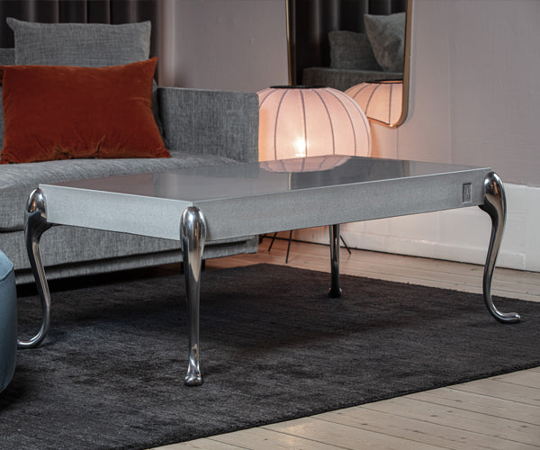 Morten Voss Flightdeck sofabord. Dette sofabord skabt af Morten Voss har idag ikon status som værende det første designmøbel produceret i beton. Historien startede i firserne hvor Morten Voss udtænkte hele konceptet bag FlightDesck sofabordet. Det blev dog først sat i produktion i 1993 og er i de senere år blevet meget eftertragtet. Betonbordet er unikt med sine svungne løvefødder som fås i flere forskellige finish. i 2010 kom den seneste hotte udgave på : 24 karat forgyldte ben ! Voss Company producerer flightdeck i flere størrelser samt en hvid compositoverflade som er mere modstandsdygtig i hverdagen. betonmaterialet som udgør FlightDeck sofabordet er inden afsendelse fra fabrikanten altid behandlet med sæbe som imprægnerer og letter den daglige vedligholdelse som gøres med almindelige sæbespåner og vand. Beton er et naturmateriale og det skal påregnes at bordet får patina og slidmærker ved brug. Dette er ikke en fejl ved produktet men det som gør det unikt.