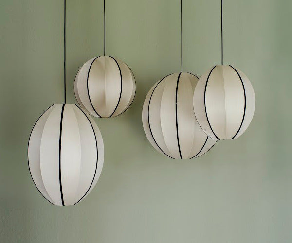 Oi Soi Oi rund lampeskærm - L. Smuk lampeskærm af kit-farvet silke med sorte kontrast bånd. Lampen måler 44 cm i diameter. Disse fine silkeskærme gør sig godt både som enkelt lampe samt i kombination med flere. Fatning kan tilkøbes, vi har vist vores forslag i relaterede produkter.