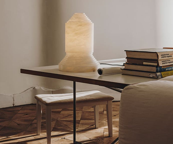 Santa & Cole Babel bordlampe designet af Àngel Jové i 1971. Denne smuke skulpturelle bordlampe er fremstillet i "Alabaster column" altså sten som også bliver brugt på gamle bygninger og monomenter. Lampen har fået navnet Babel efter det kristlige tårn som aldrig blev færdiggjort. Denne bordlampe er tilgengæld helt færdig. Håndlavet lampe med en utrolig charme.