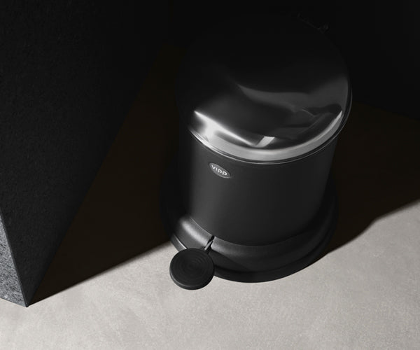 Vipp14 Sort 4 L. Vipp14 pedalspanden er en lille skraldespand til badeværelset. Denne pedalspand er udstyret med en udtagelig inderspand, et låg der sikrer lufttæt tillukning og en dæmpemekanisme, der lukker spandens låg i en blød bevægelse. En gummiring i bunden beskytter gulvet.